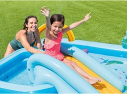 Proměňte zahradu v zábavný vodní svět s hracím centrem INTEX. Široká skluzavka s měkkou podložkou zajistí jemné a bezpečné přistání, zatímco plytký brod a větší bazének nabídnou osvěžení v horkých dnech. Integrovaná fontána s regulací průtoku vody dodá hře nový rozměr.