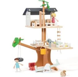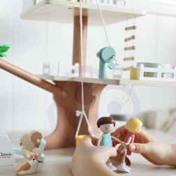 Balení obsahuje 31 prvků včetně 2 dětských figurek, 2 zvířátek a doplňků jako houpačka, houpačka–pneumatika, houpačka–rovnováha, postel, stůl, židle a truhla s pokladem. Pečlivě opracované přírodní dřevo s jemnými barvami je odolné a příjemné na dotek.
