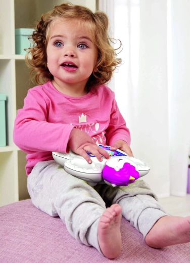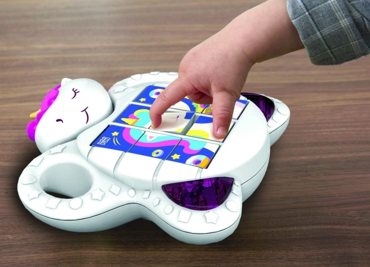 Interaktivní posuvné puzzle ve tvaru roztomilého jednorožce spojuje kreativní skládání s hravými zvuky. Děti posouvají barevné dlaždice a skládají obrázky, zatímco je motivují zvukové efekty a melodie. Hračka podporuje koordinaci ruka–oko, soustředění a první logické úlohy.