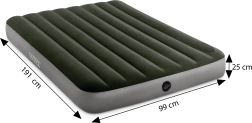 Rozměry 191 × 99 × 25 cm poskytují komfortní prostor pro jednu dospělou osobu. Kvalitní PVC se snadno udržuje a voděodolný flock zvyšuje komfort i životnost. Součástí balení je i záplata pro rychlé opravy.