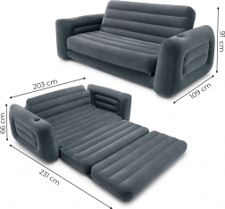 Nafukovací pohovka postel Intex nabízí komfortní a všestranné řešení pro malé prostory, umožňuje snadné přeměnění z pohovky na pohodlnou postel pro dvě osoby.