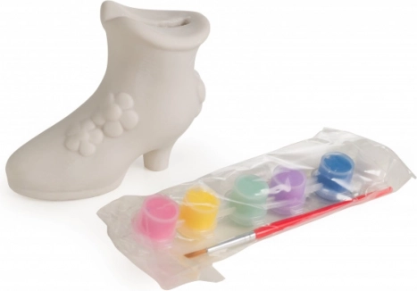 Objevte kouzlo tvořivosti s pokladničkou ve tvaru střevíčku. Tato sada obsahuje veškeré potřebné pomůcky pro vlastní návrh a dekoraci. Děti si mohou vybrat barvy a doplňky, čímž vytvoří osobitý kousek pro sbírání úspor.