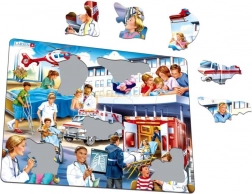 Objevte svět nemocnice s deskovým puzzle LARSEN, kde děti poznají sestřičky, doktory i pacienty. Díky pevnému okraji a speciální podložce je skládání přehledné a zábavné, což ocení i menší děti. Každý dílek je nepravidelného tvaru, bez klasických zámků – přesně tak, jako by byl obrázek jemně „rozpraskaný“.