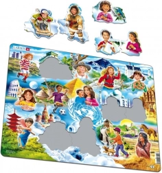 Vydejte se na výlet napříč kontinenty s puzzle LARSEN, kde se děti seznámí s kamarády z Egypta, Německa, Itálie, Číny a dalších zemí. Díky nepravidelným dílkům bez klasických zámků je skládání intuitivní a zábavné – jako by se obrázek „rozpraskal“ na unikátní části.
