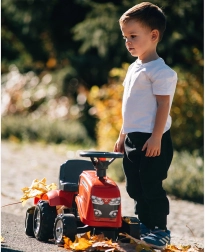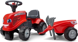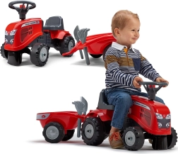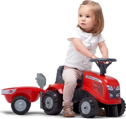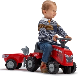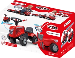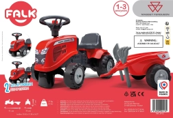 Malý jezdící traktor FALK BABY MASSEY FERGUSON s odnímatelným přívěsem potěší děti od 12 měsíců. Nabízí stabilní a bezpečnou jízdu, klakson na volantu, odnímatelnou přívěsnou káru a odolná plastová kola. Součástí jsou také hračky – lopatka a hrábě a dva sety samolepek pro personalizaci vzhledu.