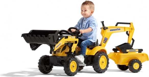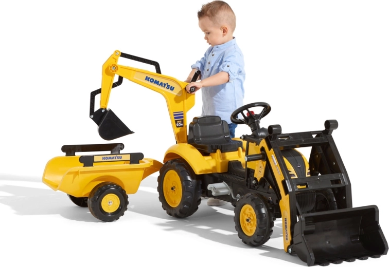 Oficiálně licencovaný šlapací traktor KOMATSU od značky FALK pro děti od 2 do 5 let přináší realistickou stavební zábavu. Má funkční přední lžíci, zadní bagr a odpojitelný přívěs, takže malí stavitelé mohou nabírat, vyklápět i převážet. Díky pedálovému pohonu posiluje fyzičku a klakson na volantu dodává hře na autentičnosti. Vyrobeno ve Francii, až 30 % z recyklovaného plastu pro udržitelnou zábavu.