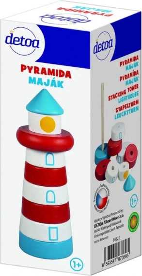 Tradiční dřevěná skládací pyramida ve tvaru majáku od značky DETOA potěší děti od 1 roku. Při skládání rozvíjí jemnou motoriku, poznávání tvarů a barev i logické myšlení. Díky masivnímu dřevu, zaobleným hranám a 9 dílům je ideální hračkou i stylovou ozdobou dětského pokojíčku.