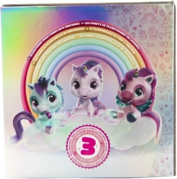 Balení obsahuje 9 tematických doplňků, se kterými si užijete spoustu fantazie: lahvičku na krmení, hřebínek, duhová křídla, sponky, samolepky, přívěšek a certifikát o adopci. K dispozici jsou 3 barevné varianty (bílá, růžová, modrá), takže si vybere každý malý kouzelník či kouzelnice.