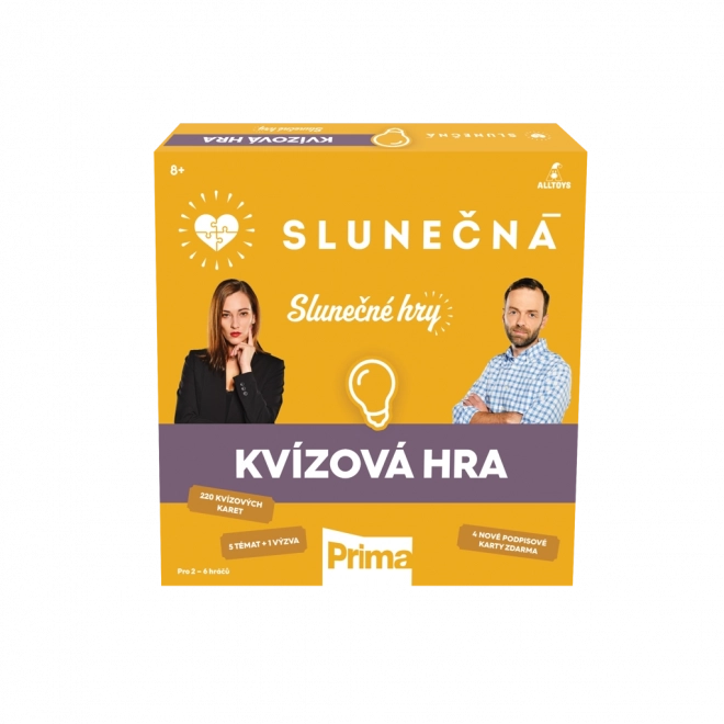Zábavná rodinná kvízová hra inspirovaná seriálem SLUNEČNÁ prověří vaše znalosti oblíbeného pořadu FTV Prima. 5 okruhů otázek + speciální kategorie Výzva, ruleta, postup po plánu a napětí až do cíle. Hra pro 2–6 hráčů, vhodné od 8 let.