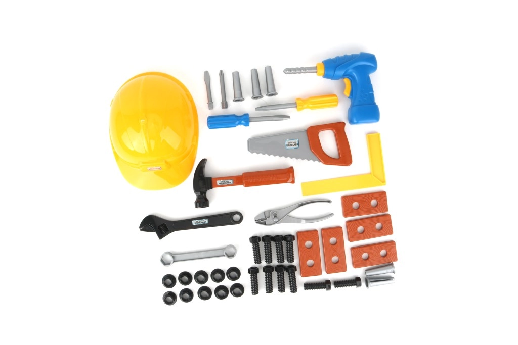 Kompletní dětská sada pro malé kutily obsahuje 42 kusů nářadí a ochrannou stavební helmu pro autentickou hru na opraváře a stavitele. Podporuje manuální dovednosti, koordinaci a kreativitu. Vybrané funkce jsou na 2× AA baterie (nejsou součástí). Vhodné pro děti od 3 let – skvělý dárek pro malé mistry a tvořivé stavitele.