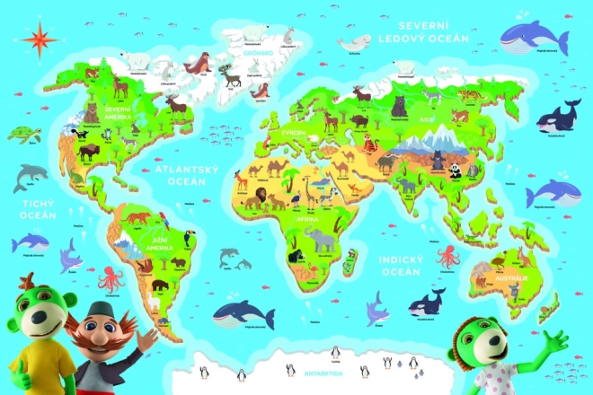 Vzdělávací puzzle pro děti s mapou světa a zvířátky, které děti učí geografii zábavnou formou. Obsahuje popisy v češtině.