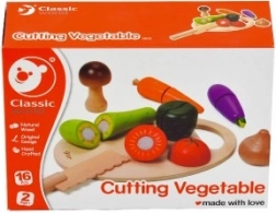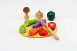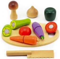 Tato dřevěná sada na krájení je perfektní hračkou pro malé kuchtíky. Obsahuje 16 realistických kusů zeleniny, které děti mohou krájet pomocí dřevěného nože a prkénka.