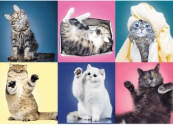 Puzzle Koťata nabízí 500 dílků s koláží sladkých koček různých plemen na barevném pozadí.