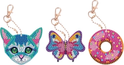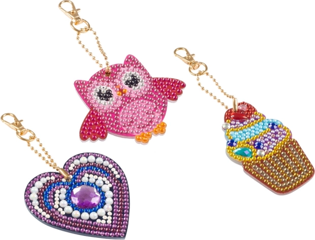 Tato sada vám umožní vytvořit si tři různé klíčenky ve tvaru sovy, zmrzliny a srdce. Každá klíčenka je zdobená barevnými kamínky, které dodají vašim klíčům osobitý styl.