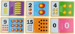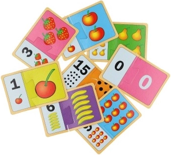 Děti párují číslice s odpovídajícím počtem obrázků ovoce a teček, čímž si přirozeně osvojují počítání a rozpoznávání množství.
