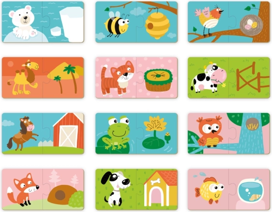 Objevte první skládanky pro malé děti: sada obsahuje 12 dvojic, kde děti spojí zvířátko s jeho obydlím. Velké a pevné dílky o tloušťce cca 3 mm usnadňují uchopení i skládání a podporují jemnou motoriku a logické myšlení.