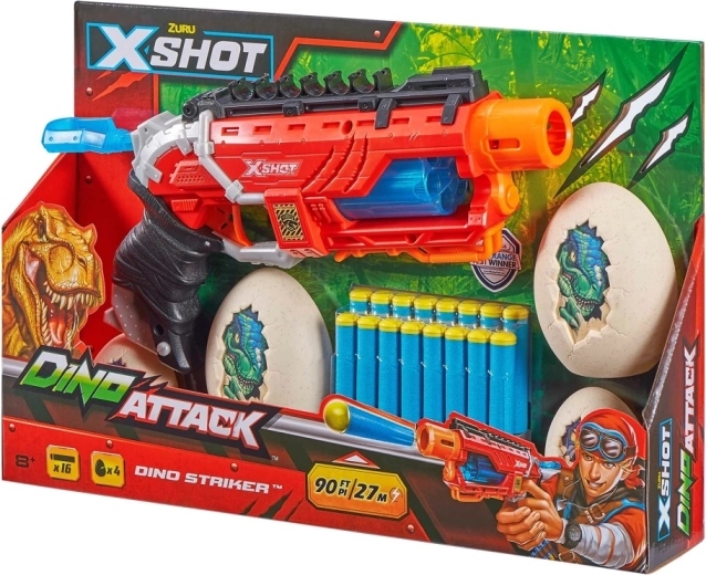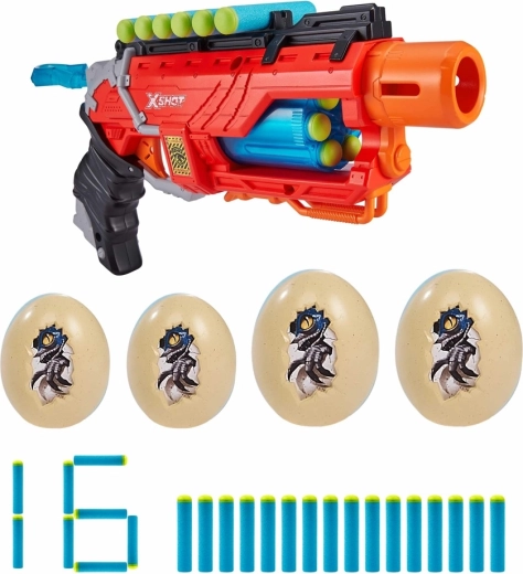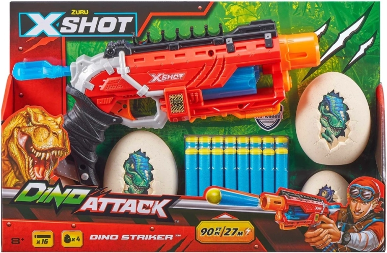 X-Shot Dino Striker z edice Dino Attack kombinuje atraktivní dinosauří design s jednoduchým mechanickým ovládáním. Stačí natáhnout, zamířit a vystřelit – ideální pro trénink přesnosti i napínavé souboje s kamarády.