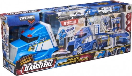 Užijte si nekonečné dobrodružství s policejní přepravní sadou Teamsterz, která obsahuje světelné a zvukové efekty, funkční výtah a pumpu a zahrnuje 4 autíčka a helikoptéru.