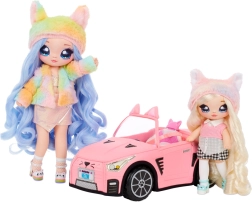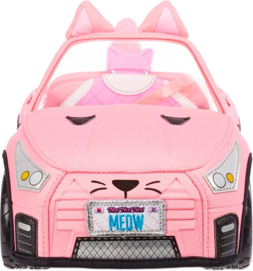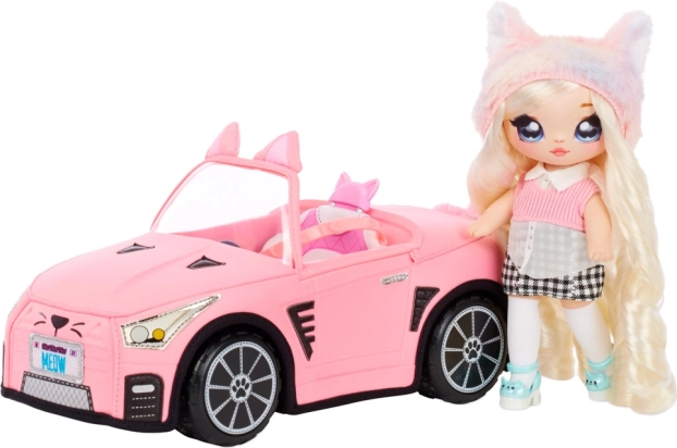 Na! Na! Na! Surprise Stylový kabriolet umožňuje panenkám cestovat s elegancí a originalitou. Toto měkké látkové auto je navrženo pro komfortní a stylovou jízdu s reálnými točícími se koly.