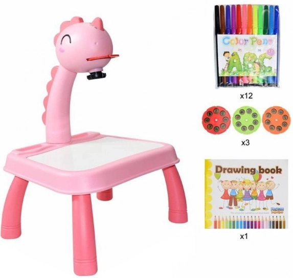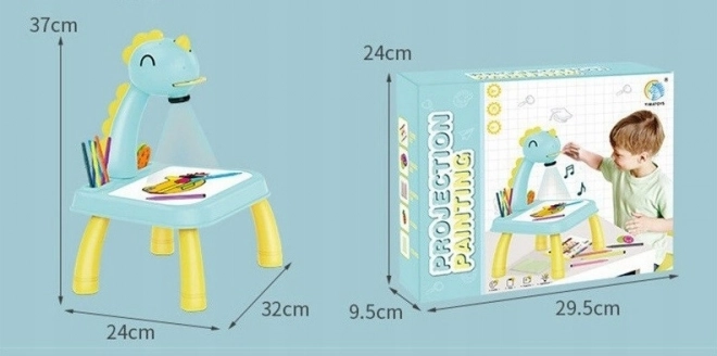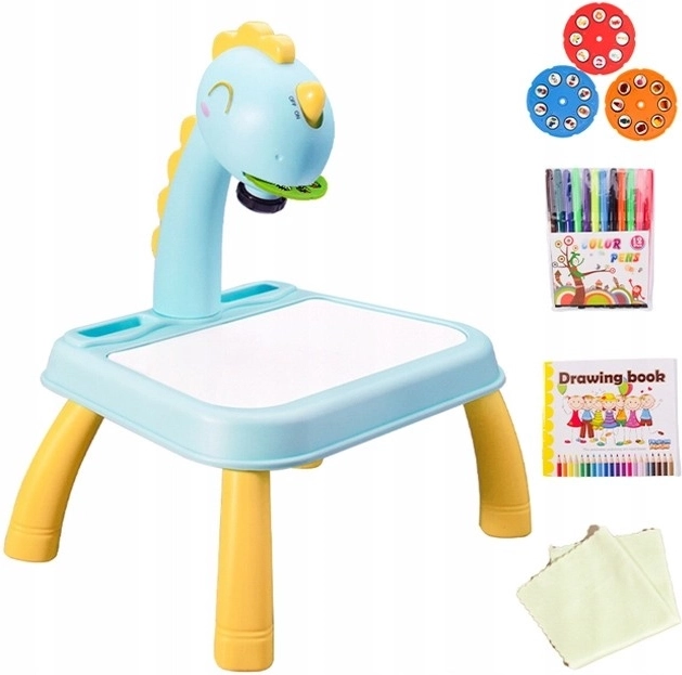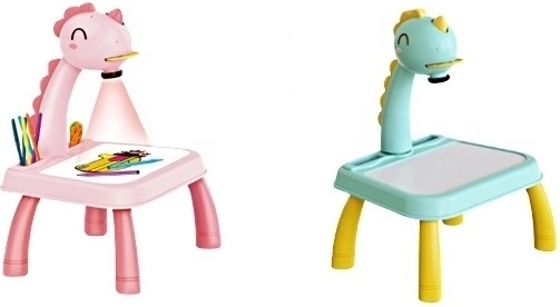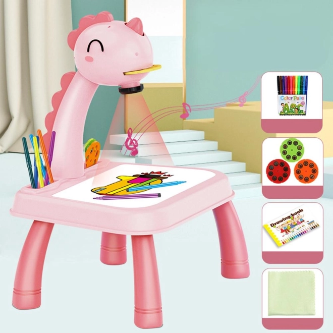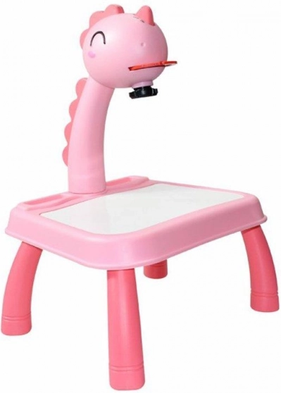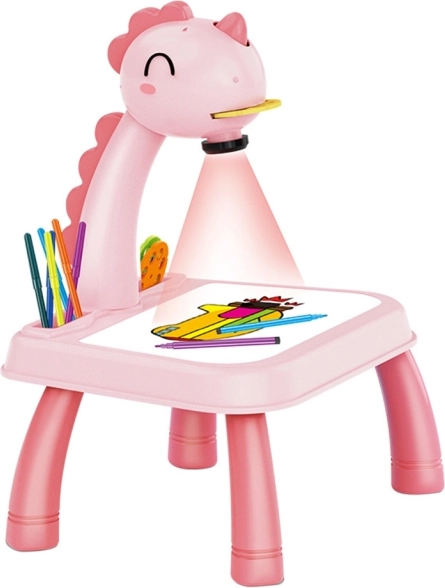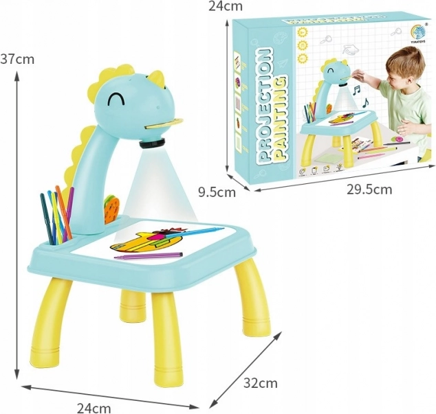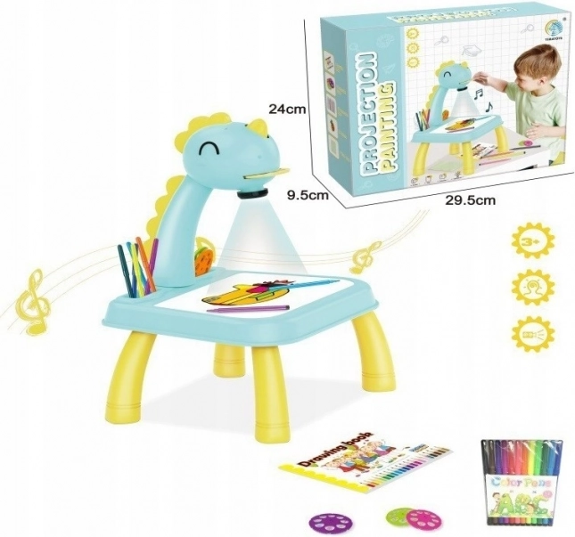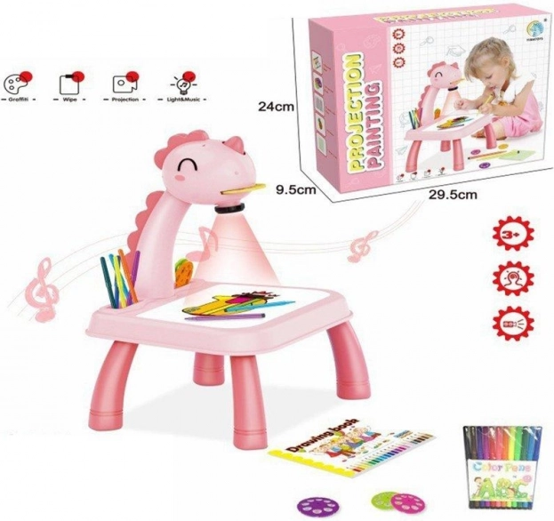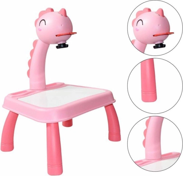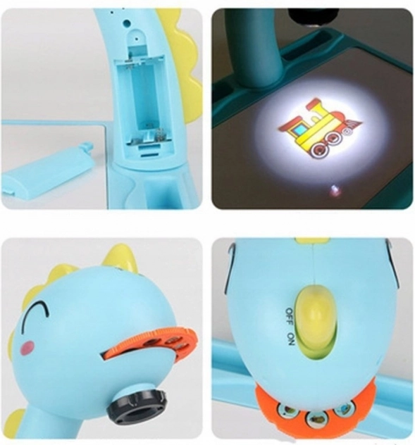 Hlava dinosaura má vypínač a melodický spínač. Po jednom stisknutí spínače se rozsvítí světlo a po druhém stisknutí spínače se spustí melodie. Můžete tak malovat s hudbou nebo bez ní. Projektor přehrává 12 různých melodií. Hlava je pohyblivá (nahoru a dolů), zatímco celým ramenem lze pohybovat doleva a doprava. Pod hlavou se nachází nastavení zaostření obrazu.