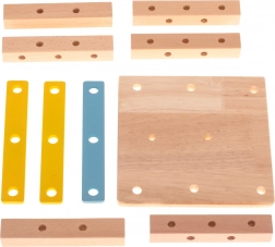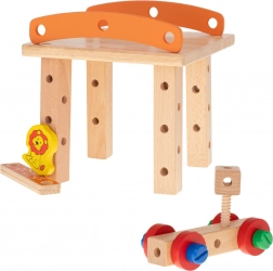 Tato kvalitní dřevěná sada umožní dětem sestavit dílenskou židličku i další originální modely. Díky šroubkům, matičkám a ozubeným kolečkům děti zkoumají principy jednoduché mechaniky, trénují soustředění a zručnost. Židlička je stabilní a díky promyšlenému systému otvorů a spojů nabízí spoustu kombinací.