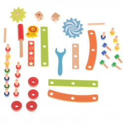 Součástí je dřevěný šroubovák a klíč, takže malí stavitelé mají vše, co potřebují. Pestrobarevné díly s hravými motivy (např. lvíček a ozubená kola) podporují kreativní hru a učí rozpoznávat barvy. Skvělý tip na edukační hračku i dárek, který zabaví na hodiny.