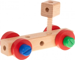 Součástí je dřevěný šroubovák, klíč, šrouby a matky – děti se učí správně spojovat díly a rozvíjejí jemnou motoriku.