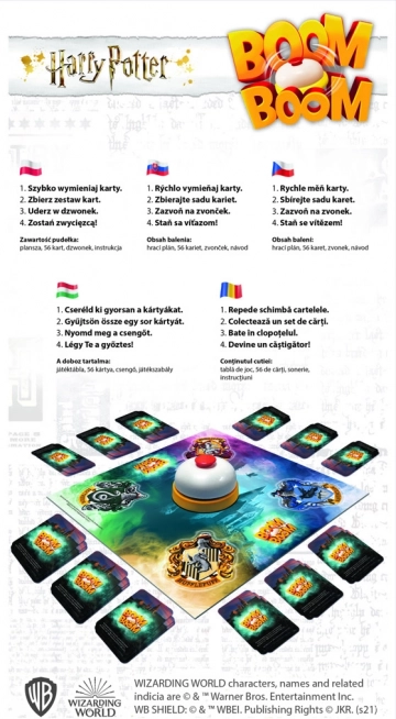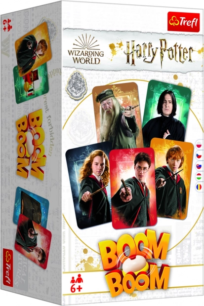 Boom Boom Harry Potter je karetní hra plná napětí a soutěže. Hráči společně hledají a skládají sady karet s oblíbenými postavami z filmu Harry Potter. Po získání sady udeří do zvonku a křičí 'Švindl!' Hra je plná dynamiky a nikdy nebudete mít chvíli na oddech. Vyhrává ten, kdo jako první nasbírá potřebné karty.