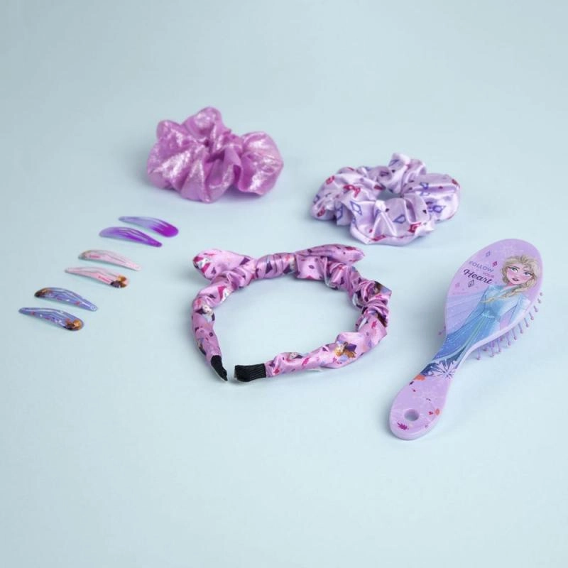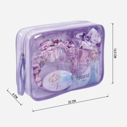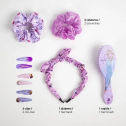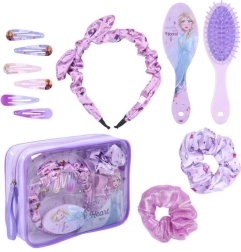 Rozkošná dárková sada doplňků do vlasů s motivem FROZEN II potěší každou malou parádnici. Obsahuje 10 praktických kousků: 6 kovových sponek s aplikací, čelenku s mašlí, kartáč a 2 saténové gumičky. Vše je uloženo v praktické taštičce na zip – ideální na doma i na cesty. Vhodné pro děti od 6 let.