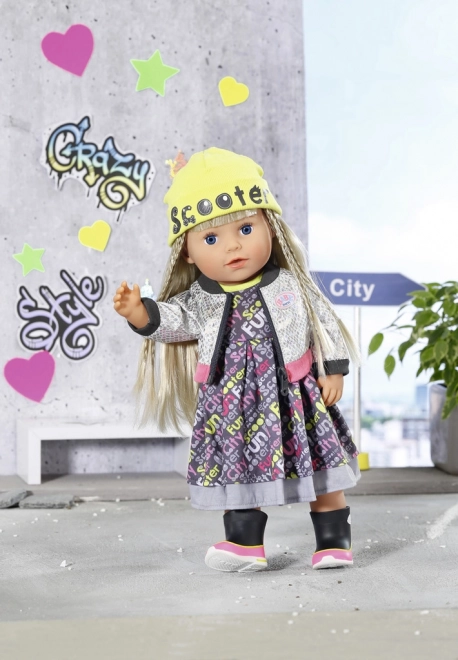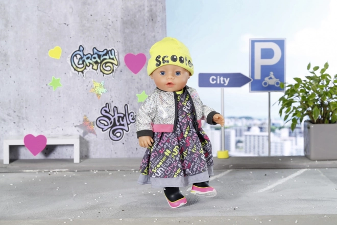Stylová městská sada pro panenky BABY Born velikosti 43 cm. Souprava obsahuje vrstvené šaty, lesklou bundu s kontrastními detaily, žlutou čepici pod helmu a barevné boty. Ideální pro snadné převlékání a dlouhotrvající kreativní hru.