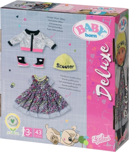 Dopřejte své panence BABY Born dokonalý městský look. Tato luxusní souprava kombinuje elegantní vrstvené šaty s písmenkovým potiskem, stylovou bundu s lesklým stříbrným vzorem a kontrastními manžetami, pohodlnou žlutou čepici a hravé barevné boty. Vše je navrženo pro pohodlí, snadné oblékání a maximální porci zábavy při hraní.