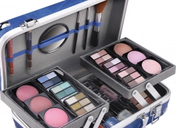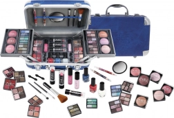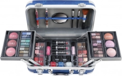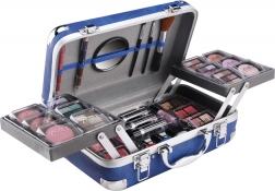 Modrý cestovní kufřík s kovovými rohy, madlem a bezpečnými přezkami chrání kosmetiku a umožňuje líčení kdykoli a kdekoli.