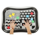 Podložka nabízí bohatou smyslovou stimulaci s kontrastními barvami a pohybujícími se barevnými tvary uvnitř. Skvěle podporuje vizuální a hmatový vývoj.