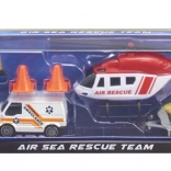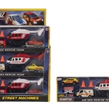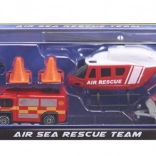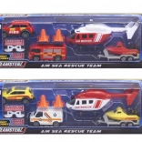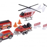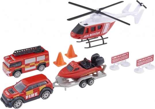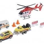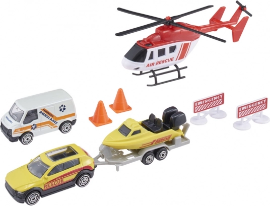 - Balení obsahuje: helikoptéru, zásahové vozidlo, 4×4 s tažným zařízením, člun nebo vodní skútr s odnímatelným přívěsem, dopravní kužely a nouzové značky.