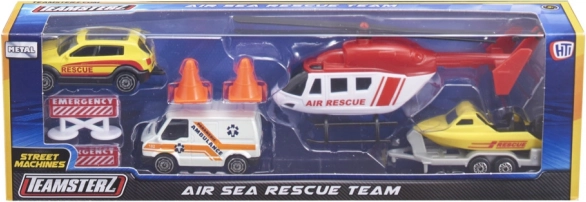 Sada Teamsterz Záchranný tým air & sea promění dětský pokoj v akční zónu plnou odvážných misí. Vysoce detailní vozidla s kovovou karoserií a plastovými doplňky vydrží intenzivní hraní a díky volně běžícím kolům se hladce pohybují po jakémkoli povrchu. Helikoptéra s ručně otáčenými listy dodává každé záchranné akci ten správný realistický efekt.