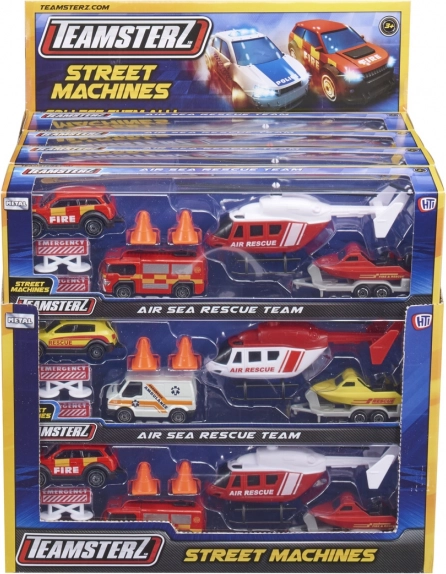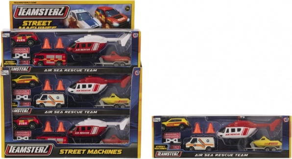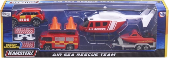 Připravte se na vlastní záchranné mise na souši i na vodě se sadou Teamsterz! Najdete v ní litou helikoptéru s ručně otáčenými listy, zásahové vozidlo, 4×4 s tažným zařízením, člun s přívěsem a nouzové doplňky. Kvalitní tlakově litá karoserie a volně běžící kola zaručí hodiny nápadité zábavy pro děti od 3 let.