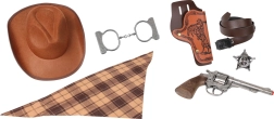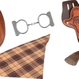 S touto sadou získáte vše, co potřebujete pro dokonalé kovbojské zážitky: klobouk, pouzdro na revolver, šátek, pouta, šerifskou hvězdu a elegantní stříbrný revolver.