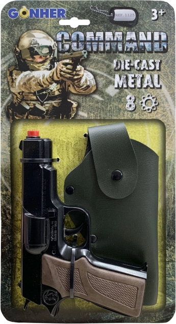 Policejní pistole Command je dokonalou hračkou pro malé strážce zákona. Tato osmiranná pistole z kovu nabízí realistický vzhled a navíc je dodávána s koženým pouzdrem pro snadné nošení.