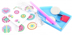 Sada obsahuje 8 barev kamínků, základ pro přívěsek a prstýnek, šňůrku, 9 šablon pro přívěsky, 4 šablony pro prstýnky, podložku a aplikační tužku – stačí otevřít a tvořit.