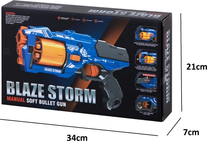 Různé detaily v podobě reliéfů a grafiky, díky nimž hračka připomíná zbraň z počítačové hry, ji činí atraktivní pro děti různého věku. Hračka potěší fanoušky počítačových her, kteří mohou své potyčky přenést do reálného světa a zároveň i běhat! Taková hra venku napomáhá motorické koordinaci a má pozitivní vliv na fyzické zdraví vašeho dítěte. Pistole vás povzbudí k aktivnímu trávení volného času venku. Blaze Storm je velká hračka, která vašemu dítěti poskytne hodiny zábavy. Navzdory své velikosti není těžká, takže její ovládání zůstává snadné a zábavné. Hračka poskytuje značnou výhodu nad soupeřem. Střílí nejen rychle a přesně, ale i na velkou vzdálenost. Pušky nevyžadují baterie. Stačí naplnit bubnový zásobník šipkami, nabít zbraň vytažením závěru zpět a vystřelit.