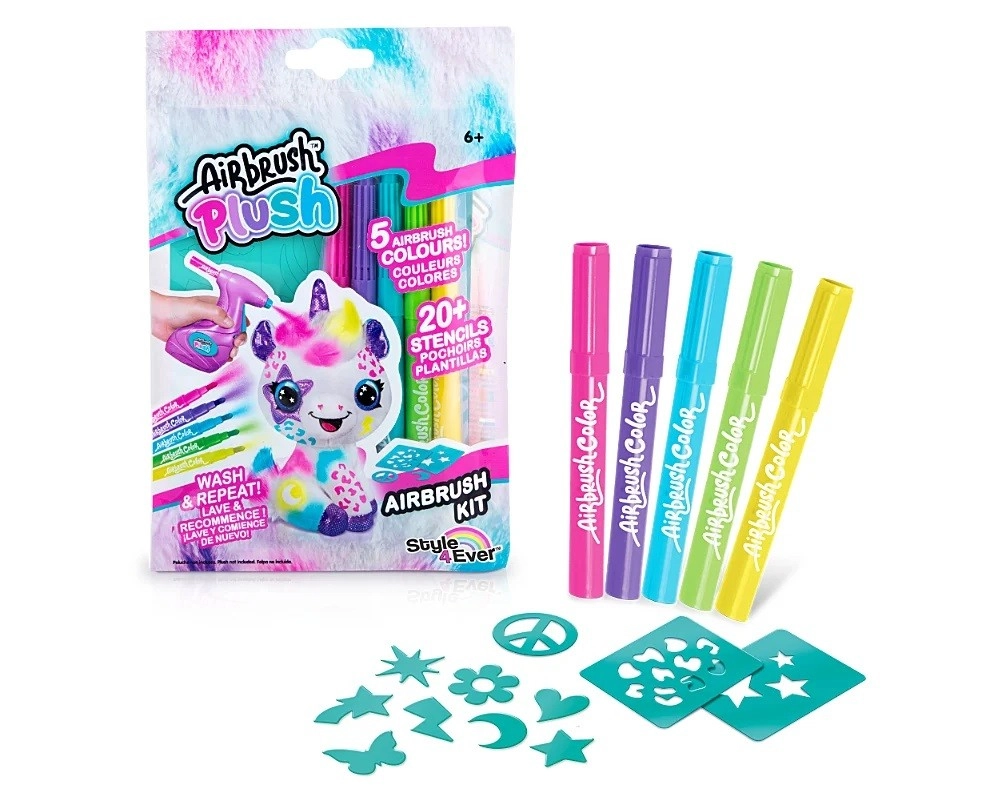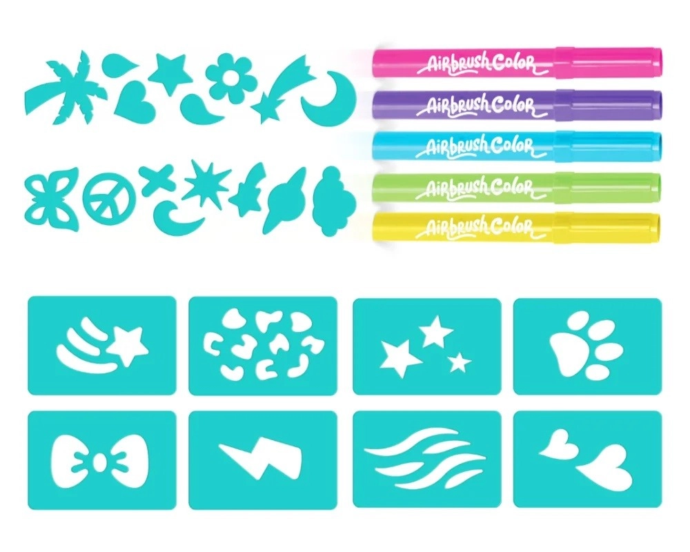 Doplňte svůj kreativní set o praktické náhradní náplně do airbrushe. Balení obsahuje 5 výrazných barev a 20 šablon pro snadné a zábavné tvoření. Ideální pro děti od 6 let, které rády malují a objevují nové techniky.