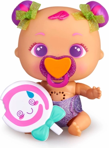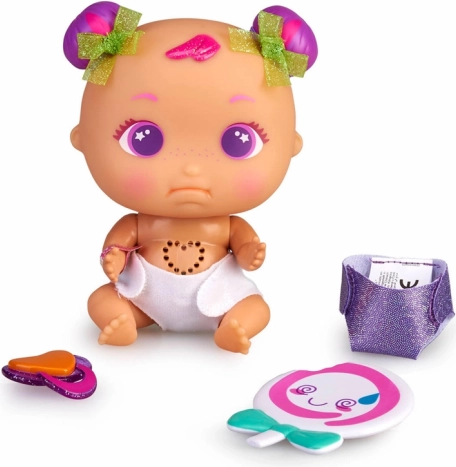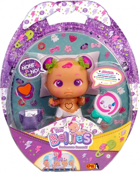 Roztomilé interaktivní miminko z kolekce Bellies Sweet Tummies potěší děti veselým žvatláním, tlukotem srdíčka a hravými doplňky. Každá panenka má své unikátní mateřské znaménko a součástí jsou třpytivé plínky, dudlík a další zábavné doplňky pro kreativní hraní.