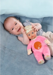 Panenka je navržena pro nejmenší: různé textury materiálů podporují rozvoj smyslů a zvědavé prstíky. V případě ušpinění lze panenku snadno vyprat v ruce – stačí vyjmout zvukový modul. Baterie jsou součástí balení, takže je připravena k použití hned po rozbalení.
