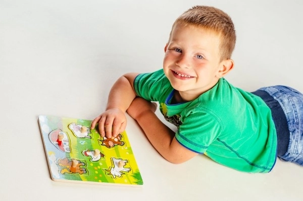Každý dílek vkládačky je opatřen malou dřevěnou úchytkou, díky které si děti snadno procvičují uchopování a pokládání dílků na správné místo.