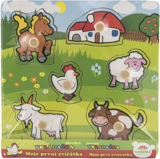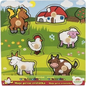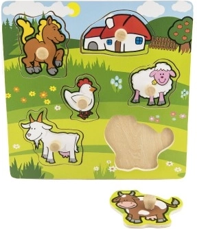 Tato vkládačka obsahuje celkem 5 barevných zvířátek včetně koníka, kozy, ovečky, slepičky a krávy, které jsou snadno uchopitelné díky malým dřevěným úchytkám. Každý z dílků má své místo na dřevěné podložce, což rovněž pomáhá dětem naučit se správnému umístění každého dílku.