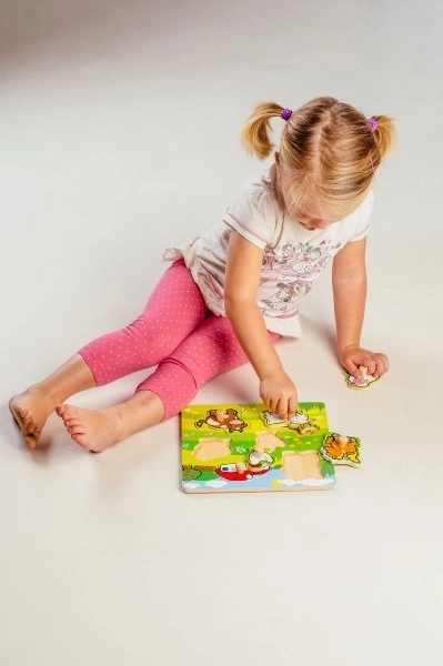 Dřevěná vkládačka Farma je ideální hračkou pro malé děti, která rozvíjí jemnou motoriku a poznávání zvířat pomocí barevných dílků s úchytkami.