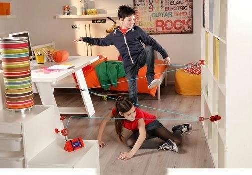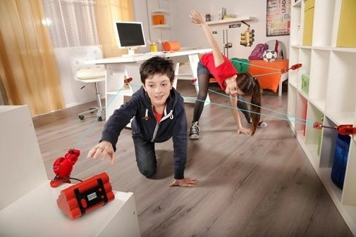 Červené jednotky a svorky vytvoří síť modrých „laserů“. Děti se učí obratnosti a koordinaci, zatímco se baví v bezpečném domácím prostředí.