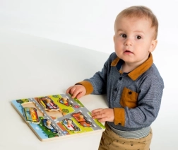 Každý z šesti vkládacích obrázků představuje jiný dopravní prostředek, a to policajní auto, autobus, sanitku, hasičský vůz, popelářský vůz a osobní auto. Skládání je snadné díky dřevěné podložce a úchytkám, které malým ručkám usnadní manipulaci s díly.