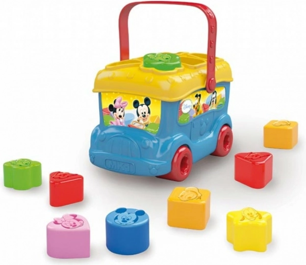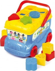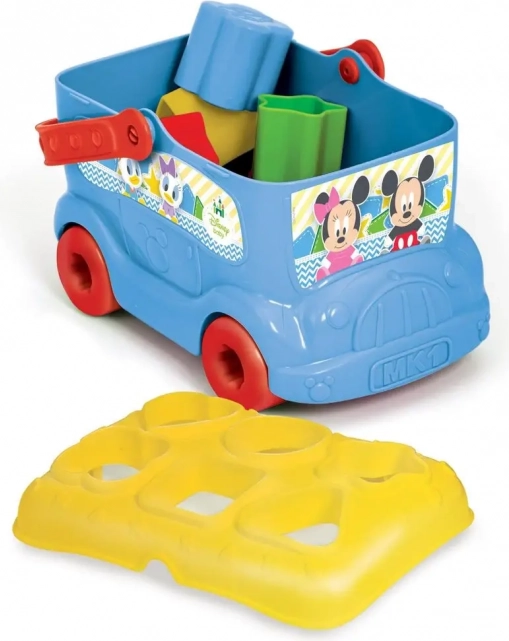Vkládací autobus Disney Mickey je plastový box ve tvaru autobusu, který je nejen veselý na pohled, ale také velmi praktický. Jeho víko obsahuje otvory pro vkládání tvarů, což umožňuje dětem trénovat logiku a jemnou motoriku. Tento autobus obsahuje devět barevných kostek různých tvarů.