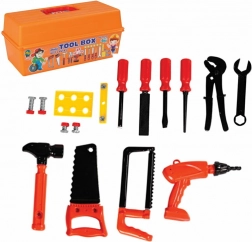 - 34dílná sada: vrtačka, šroubovák, pila, klíč, kladivo, kleště a různé spojovací prvky.